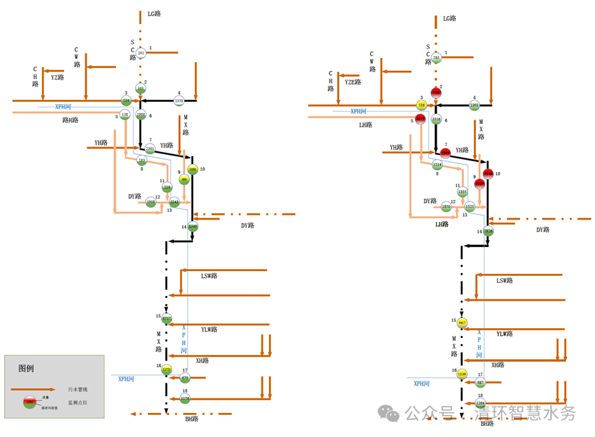 根据污水管道运行风险评估结果,各监测点位在旱天条件下虽存在局部运行风险偏高的情况(9号、10号、16号),但未发生旱天溢流现象,表明X河沿线水质下降与旱天污水管道运行状况无直接关联。